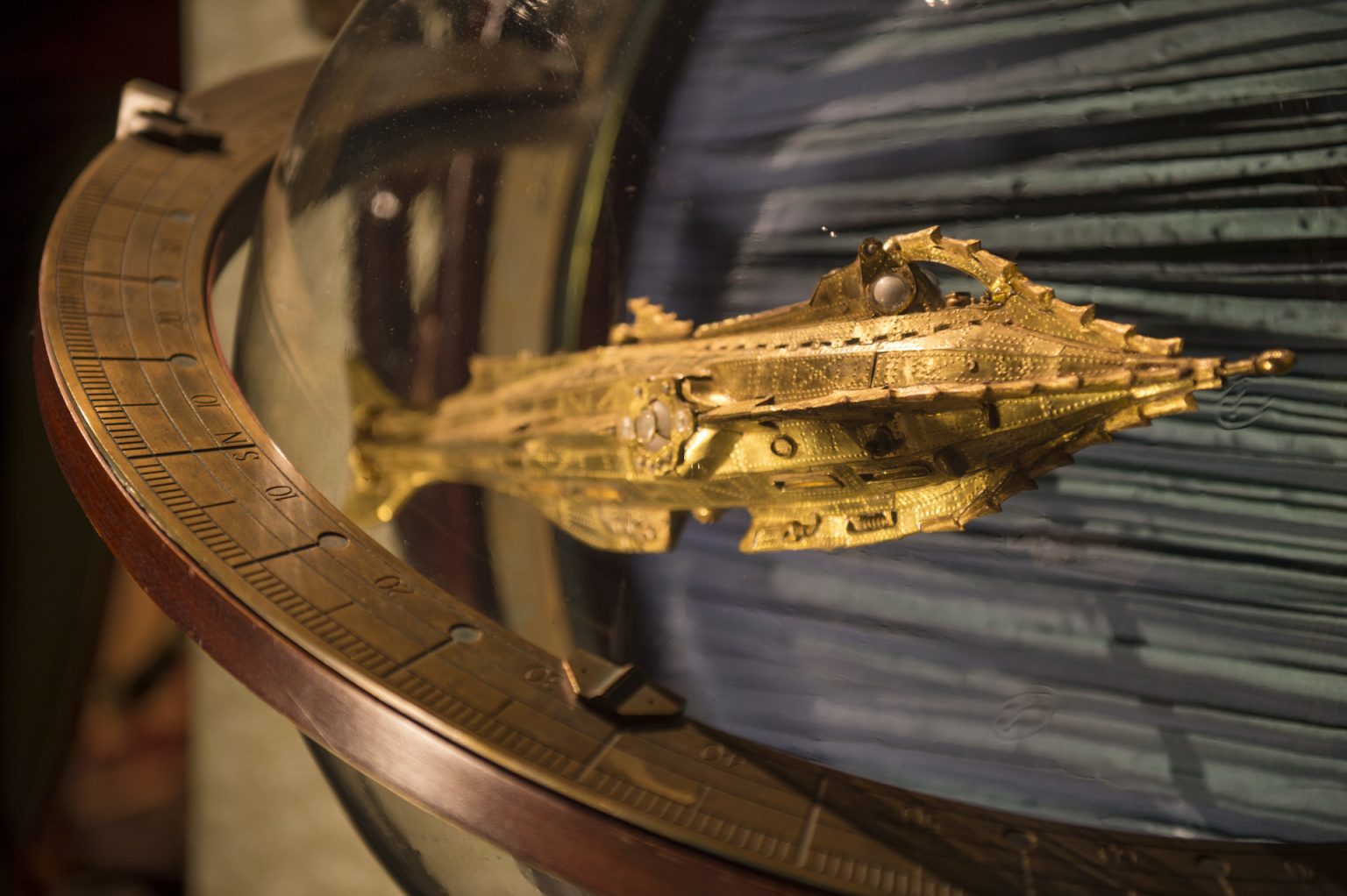 Il camino è un capolavoro in sé. È stato disegnato da Eddie Sotto, ispirato a quello immaginato da Alphonse Mucha per la gioielleria Fouquet, ora situata al museo Carnavalet di Parigi.  Scolpito in noce amazzonico, è sormontato da una sfera armillare stilizzata (un modello della sfera celeste) che rievoca il romanzo Dalla Terra alla Luna, e nella quale galleggia un modellino del Nautilus creato da Tom Sherman, il direttore artistico di i Misteri dell’attrazione Nautilus.