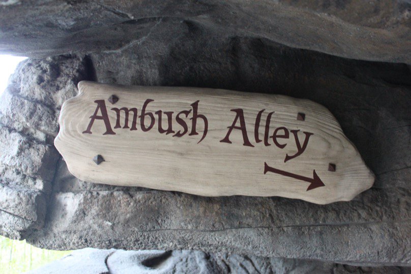Passiamo accanto ai resti scheletrici dei pirati lasciati alle spalle in modo che non potessero rivelare la sua posizione, dopotutto “Dead Men Tell No Tales”. Un altro percorso passa attraverso il “Bottomless Pit” e su ponti che ci portano tra cascate con un breve sguardo al mondo esterno. Di nuovo nelle caverne, dobbiamo attraversare il “Labirinto di stalagmiti” per raggiungere finalmente il “Trono dei pirati” e la scena del tesoro di Ben Gunn dove un altro scheletro di pirati è morto cercando di possederlo.