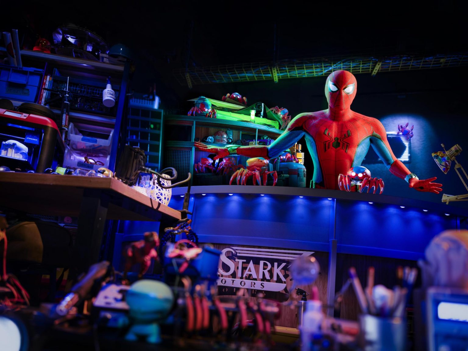 Il workshop mette in mostra il lavoro di Peter Parker e del suo team, inclusi i loro adorabili Spider-Bot, robot che hanno la capacità di costruire tutto ciò di cui i Supereroi hanno bisogno.